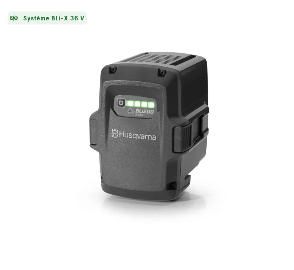 La batterie Husqvarna BLi200 est une batterie Lithium-Ion intégrée de 36 V avec une capacité de 5,2 Ah et une énergie de 187 Wh. Offrant un excellent rapport poids/puissance (environ 1,3 kg), elle est conçue pour une utilisation polyvalente avec la plupart des outils à batterie Husqvarna (Système Bli-X), assurant des performances durables.