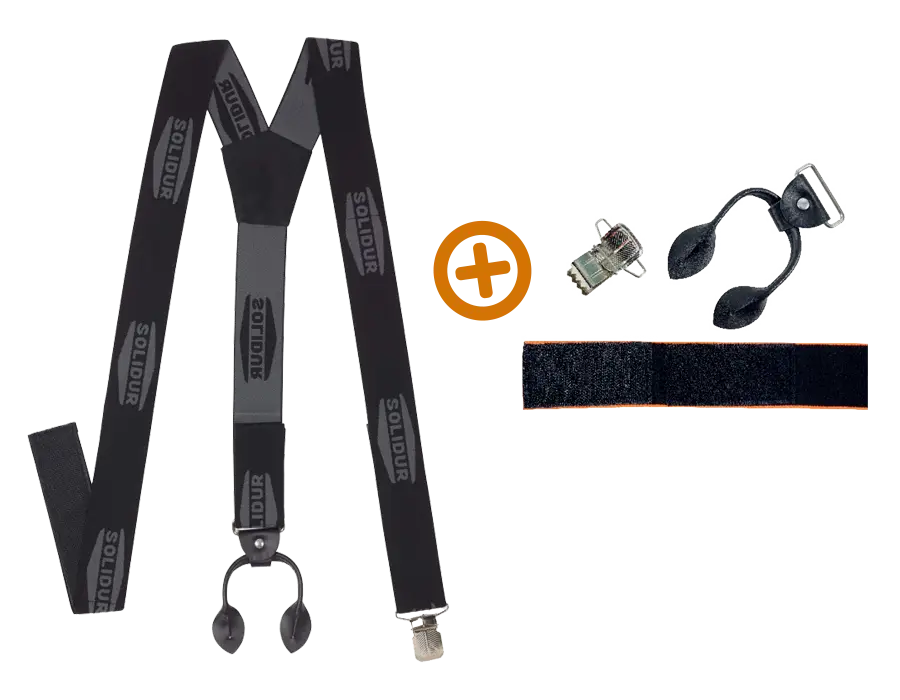 Ces bretelles noires Solidur sont indispensables à la bonne tenue de votre pantalon de sécurité. Cet accessoire supprime les points de pression qui se forment avec le harnais et permet ainsi un travail plus confortable.