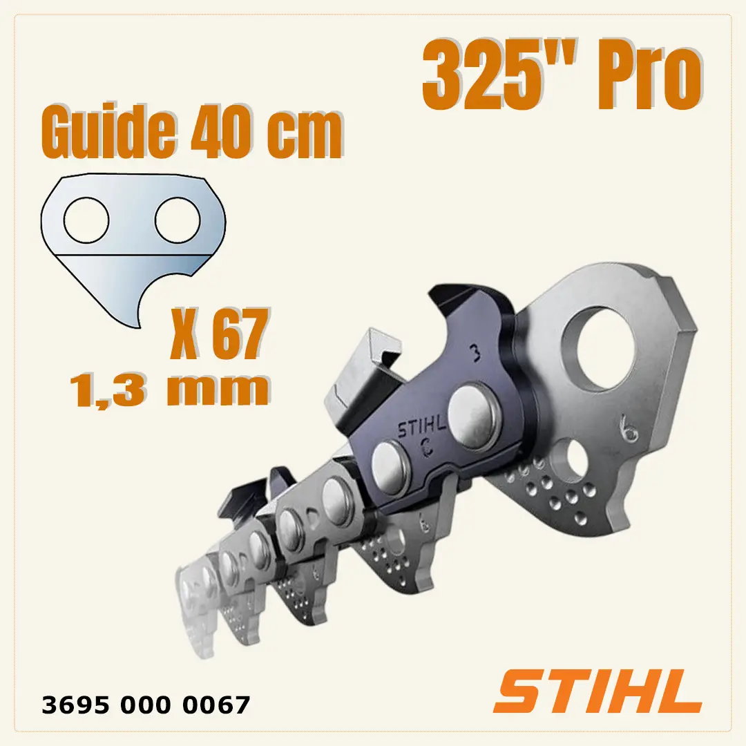 Chaîne compatible avec les machines récentes STIHL comme la MS 231 , MS 231 CB-E et plus encore. Elle convient aux machines équipées d’un guide 40 cm en 325 avec une épaisseur de jauge de 1.3 mm.