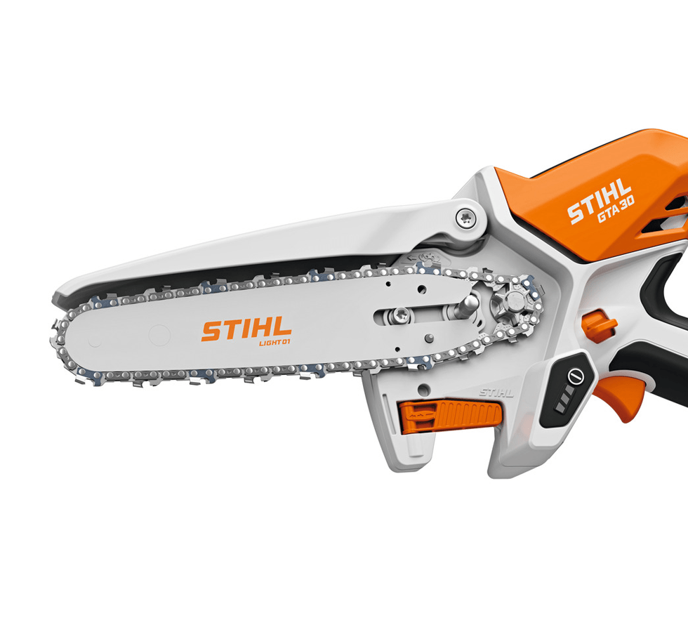 Stihl a entièrement repensé la conception de la Stihl GTA 30 pour offrir une prise en main encore plus sûre et agréable. Sa poignée ergonomique SoftGrip garantit un maintien parfait, même d’une seule main, tandis que son carter de protection réglable augmente la sécurité sans nuire à la visibilité de coupe. La tension de chaîne sans outil facilite l’entretien, permettant de toujours travailler avec précision, même après plusieurs utilisations.