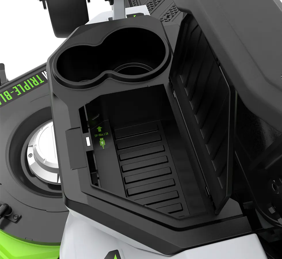 La Zero Turn EGO ZT5201E-L mise aussi sur l’ergonomie. Son siège premium à suspension intégrée, ses accoudoirs ajustables et son tableau de bord intuitif en font une machine agréable à piloter, même sur de longues sessions. Son écran LCD couleur centralise les informations clés : vitesse, niveau de batterie, hauteur de coupe, mode sélectionné (Standard, Control ou Sport).